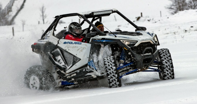 Vrcholným zážitkem jízdy ve dvou stopách pak bylo svezení s dvoumístnou čtyřkolkou Polaris RZR Pro XP s přeplňovaným motorem 0,9 litru. Poháněna jsou standardně zadní kola, při jejich prokluzu se elektromagneticky připíná pohon přední nápravy. Stroj příjemně překvapil svojí hbitostí a schopností klouzat sněhovými závějemi rychle a snadno řízenými přetáčivými smyky. Podobně jako u ostatních čtyřkolek Polaris, také v tomto případě všechna kola spočívají na dvojitých lichoběžníkových závěsech.