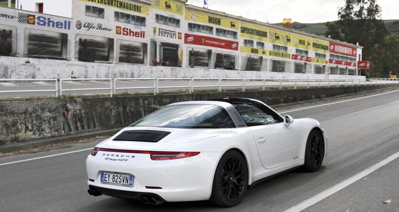Porsche 911 Targa se zrodila na podzim 1965 na počest vítězství v Targa Florio 1964 jako první kabriolet na světě s výrazným ochranným obloukem, dodávky započaly na jaře 1966 jak se čtyřválcem 912, tak se šestiválcem 911. Nová 911 Targa 4 GTS, s níž jsme v Palermu zahájili vzpomínkovou jízdu, je prvním modelem Targa v provedení GTS (premiéra na NAIAS 2015 v Detroitu), hned rozeznatelným pro rozšířené zadní blatníky o 22 mm verze s pohonem všech kol, přičemž pneumatiky vzadu jsou o 10 mm širší. Sportovní design přídě charakterizují rozšířený vstup vzduchu a zatmavené bi-xenonové světlomety se systémem PDLS (Porsche Dynamic Light System), černá litá kola 20“ z 911 Turbo S mají centrální matice, vůz zdobí loga targa a GTS. Výkon boxeru 3,8 l se zvýšil ze 294 na 316 kW (tedy ze 400 na 430 k) při 7500 min‑1, standardně se dodává paket Sport Chrono, sportovní výfukové potrubí s chromovanými koncovkami, podvozek PASM a elektricky ovládaná otevírací střecha. Měrný výkon klesl ze 3,9 na pouhých 3,6 kg/k (2,65 kW/k). Jezdili jsme se sedmistupňovou dvouspojkovou převodovkou PDK, akcelerace je impozantní (0 – 100 km/h za 4,3 sekundy při hmotnosti vozu 1580 kg), ale největší rychlosti 301 km/h jsme nedosáhli. Klasická Carrera GTS se shodným motorem 3,8 l/316 kW (430 k) jede dokonce 306 km/h, hmotnost klesla na 1425 kg.