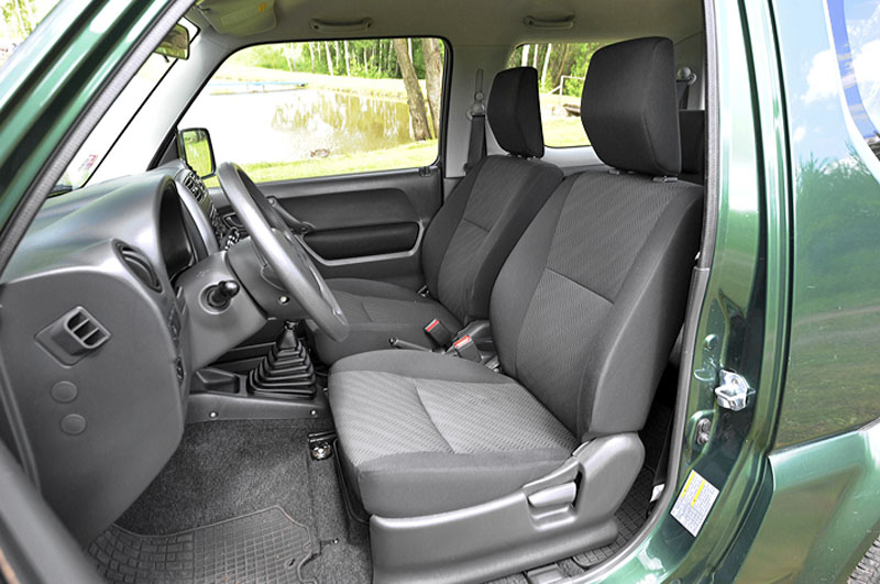 V krkolomných situacích se osvědčí schopnost citlivé práce s plynovým pedálem a spojkou, která zajistí přesné dávkování hnací síly ke kolům, a to i v případě jízdy s redukcí. Na silnici není Jimny tak suverénní, ale je určen především pro kratší vzdálenosti. Jízdní vlastnosti limituje vyšší stavba i malá šířka. Odpružení, které se v terénu výtečně vyrovnává s nerovnostmi, je na silnici tvrdé a omezuje komfort. Jediným elektronickým systémem podvozku je ABS/EBD. Interiér Jimny neoplývá zejména v příčném směru přebytkem místa, nicméně pobyt na předních sedadlech není nijak nepříjemný.