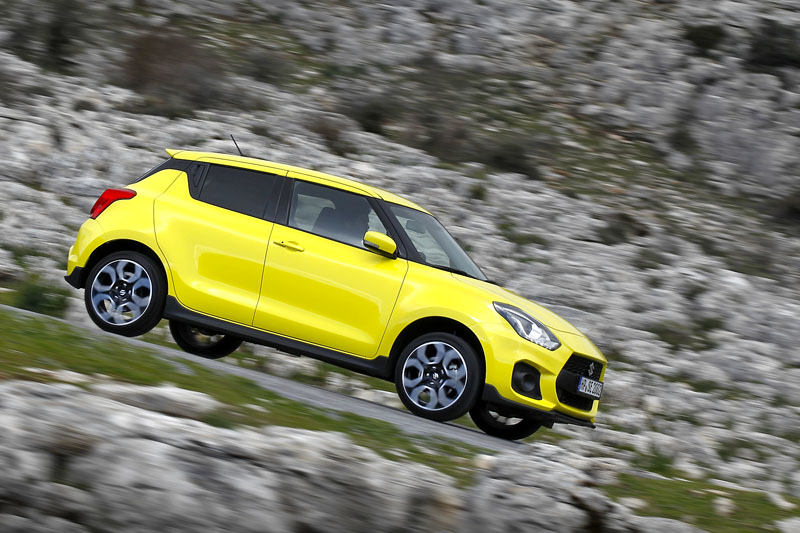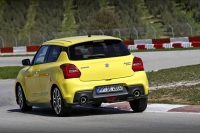 Ve srovnání s předchůdcem má nový Swift Sport o 20 mm delší rozvor a o 40 mm větší rozchod kol, což mu propůjčuje větší stabilitu v přímém směru a ve vyšších rychlostech, ale také dynamický postoj. Suzuki se nechala inspirovat předchozím Swiftem Sport a jeho jízdní vlastnosti jemně doladila a vylepšila. Stabilizátory jsou uloženy v pevnějších pouzdrech s vrstvou teflonu, byla zvýšena tuhost přední nápravy a v zatáčkách tak náprava lépe drží nastavený odklon předního kola. A to vše bez přehnaného zvyšování tuhosti pružin nebo stabilizátoru. Zadní náprava je ve srovnání s tou v běžném Swiftu rovněž upravena. Vlečená ramena jsou pro Swift Sport zcela nová a opět jsou tužší, aby lépe odolávala deformaci v rychle projížděných zatáčkách a neměnila se tak geometrie zadní nápravy. Stejně tak byla upravena zadní zkrutná příčka s ohledem na požadovanou vyšší pevnost. Na všech čtyřech kolech jsou pak použity sportovní tlumiče Monroe. Takzvanou komunikační barvou nového Swiftu Sport je žlutá Champion Yellow, odkazující na barvu závodních Suzuki, když ještě brázdily tratě rychlostních zkoušek. Vlastně jsme Swift Sport v žádné jiné barvě neviděli, protože i na prezentaci byly všechny vozy právě v tomto odstínu. Žlutá ovšem Swiftu Sport sluší, už třeba jen proto, že pěkně kontrastuje s černými doplňky. Ale nejen ty Swift Sport odlišují, jiný je také přední nárazník s většími vstupy vzduchu a sportovně vyhlížející mřížkou masky chladiče, Swift Sport má rovněž velmi povedená 17“ kola, spoiler na konci střechy a jiný je i zadní nárazník, který na obou stranách zdobí efektní koncovka výfuku.