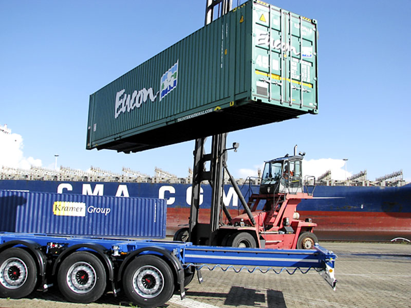 Samozřejmě že takové tahače mají v nabídce všichni výrobci velké evropské sedmy, tedy DAF, IVECO, MAN, Mercedes-Benz, Scania a Volvo s Renaultem. Podívejme se, jak tento úkol řeší technický vývoj německé rodinné společnosti Krone, jejíž „modrá divize“ patří k největším evropským výrobcům přívěsů a návěsů. Navíc ještě „zelená divize“ tradičně vyrábí zemědělské stroje včetně kombajnů. V bohatém výrobním programu přípojných vozidel má nyní Krone čtyři nosiče kontejnerů BoxLiner, z toho dvě absolutní novinky. Jsou to typy SDC27eL TU5 a SDC27eL TU70 s možností plynulého nastavení vzdálenosti náprav podvozku od točny návěsu a nastavitelným převisem od 525 mm. Použití velmi kvalitních konstrukčních ocelí na rámy umožnilo zásadní snížení hmotnosti podvozku. Jeden podvozek tak může převážet dva kontejnery 20 stop, nebo jeden 30, 40 a 45 stop. Při převážení jen jednoho krátkého nebo středního kontejneru jej lze ještě upevnit buď na konci podvozku, nebo v tzv. střední poloze mezi točnicí a nápravami. Tak je možné dosáhnout optimálního rozložení hmotnosti kontejneru na nápravy tahače a návěsu. S ohledem na variabilitu jsou nenápadnou technickou finesou patky upevňující spolehlivě kontejner k rámu podvozku, jejichž obsluha musí být jednoduchá. Sečteno a podtrženo. Zboží, které v kontejnerech putovalo týdny po světových mořích, je v přístavu Rotterdam vyloděno a uloženo v překladišti, přičemž odběratel dostává avízo. Ještě týž den se může řidič přihlásit k nakládce. V určený čas předjede na molo, připraví podvozek a během několika minut je naložen. Po vyřízení dokladů k nákladu může odjet. Z Rotterdamu je to do Prahy asi 1000 km, převážně po dálnicích. Zboží tak bude dovezeno do logistického centra již druhý, nejpozději třetí den. Trochu pomalejší variantou je převoz kontejnerů po železnici a tou nejzdlouhavější, ale také nejlevnější je říční doprava přes Hamburk po Labi a Vltavě.