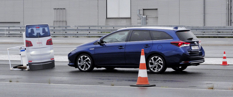 Představení novinky jsme zahájili na zkušebním polygonu společnosti Toyota Motor Europe v Zaventemu nedaleko Bruselu, kde jsme vyzkoušeli zařízení Pre-Collision pro zabránění střetu, anebo alespoň ke snížení jeho následků. Do konce roku 2015 by mělo být systémem Toyota Safety Sense vybaveno celkem 70 % nových vozů této značky na evropském trhu, ať už ve standardní výbavě, či za příplatek (u nás čtrnáct tisíc korun českých navíc). Základem dílčího systému Pre-Collision je detekce překážky kombinací kamery a lidaru (laser/radar) do jediné jednotky, která sdružuje přednosti obou snímačů, u prvního to je velmi dobré určení tvaru objektu, u druhého vysoká přesnost odečtení vzdálenosti.