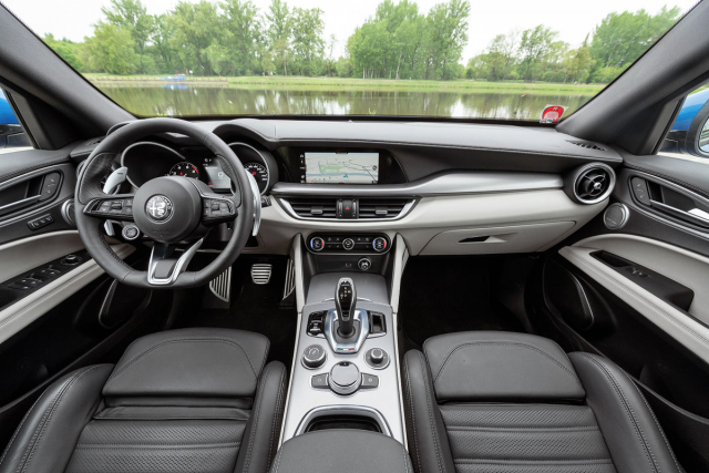 Mezi silné stránky Alfy Romeo Stelvio Veloce patří interiér. Od ostatních verzí se liší kromě jiného sportovním vyhřívaným volantem, sportovními sedadly s koženým čalouněním a dofukováním bočnic, hliníkovým obložením interiéru či pedály s nerezovými kryty. Zkoušený vůz byl vybaven i příplatkovým (67 000 Kč) paketem Výkon, jehož součástí jsou kromě zadního samosvorného diferenciálu a aktivních tlumičů také velké hliníkové, pevně na sloupku umístěné řadicí páčky. Svým stylem odkazují na italskou tradici, kterou v posledních desetiletích vytvořily hlavně vozy Ferrari. Spolu se startovacím tlačítkem na volantu je právě toto jedním z detailů dodávajících tomuto vozu na jedinečnosti a výjimečnosti.