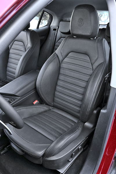 Otočný ovladač vedle voliče převodovky umožňuje vybírat z provozních režimů D (dynamický), N (normální) a A (hospodárný). Provedení Super přidává osmnáctipalcová kola nebo kombinaci koženého a textilního čalounění v různých barevných variantách, zatímco vrcholné Business, zaměřené na fleetové zákazníky a dostupné zatím pouze se vznětovým motorem, vyniká třeba navigačním systémem, bi-xenonovými světlomety s natáčením do zatáčky nebo elektricky sklopnými zrcátky. Za vše ostatní si u Alfy nechají připlatit, ať již jde o adaptivní tempomat, celokožené čalounění s elektricky stavitelnými a vyhřívanými předními sedadly či dekorační obklady z pravého dřeva. Na výběr je ze třinácti odstínů laku a stejného počtu litých ráfků s průměrem 17 až 20 palců. Nabídka pohonných jednotek bude stejná jako u Giulie, zážehové motory tedy sestávají ze čtyřválce 2.0T s technologií MultiAir (elektrohydraulické ovládání sacích ventilů, viz AR 6/’09; 147 nebo 206 kW), šestiválce 2.9 BiTurbo/375 kW (pro Quadrifoglio) a vznětového čtyřválce 2.2 MultiJet II (110, 132 nebo 154 kW). Ano, „diesel“ má ve skutečnosti objem 2,1 l, ale výrobce jej prostě označuje „2.2“. Slabší z nich budou k dispozici také s pohonem zadních kol, na většinu ale čeká pohon všech kol Q4, přičemž samočinná převodovka je na rozdíl od Giulie standardem pro všechny agregáty.