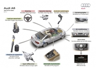 Kvalita provedení a velké možnosti bohaté výbavy jsou u Audi samozřejmostí. Připomeňme třeba jen Head-Up displej, aktivní světlomety, denní svícení LED, systém nočního vidění s identifikací chodců, MMI s navigací, přístup na internet, adaptivní tempomat, parkovací asistent do příčné i podélné mezery (prvně u Audi), bezpečnostní systém PreSense se samočinným brzděním před překážkou, kontrolu jízdy v pruhu atd. Sedmá generace bude také první, která dostane nejen kombi A6 Avant, ale i hybridní verzi A6 Hybrid. Její pohonnou jednotku tvoří čtyřválec 2.0 TFSI/155 kW (211 k), elektromotor 33 kW, 211 N.m, uložený místo měniče v osmistupňové skříni Tiptronicu, a kompaktní akumulátory Li-Ion 1,3 kWh. Hybridní A6 ujede tři kilometry čistě elektricky, s elektromotorem dosahuje rychlosti do 100 km/h. Klasická A6 byla uvedena na německém trhu od 38 tisíc eur.