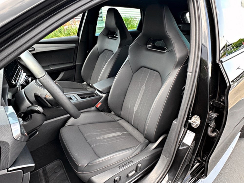 Cupra přitom tento agregát kromě základní varianty nabízí za příplatek 60 tisíc korun také ve verzi VZ Line, tedy provedení přidávajícím několik zajímavých prvků podtrhujících sportovnost navíc. Zvenku se tato verze odlišuje rozšířenými prahy lakovanými v tmavě šedé barvě, protaženým střešním spoilerem a koly s výraznějším designem a stále průměrem 18 palců. Uvnitř je ovšem změn o poznání více. Jde zejména o skvěle tvarovaná sedadla označovaná jako Cupra Sharp. Naštěstí svému označení příliš nedostojí, protože poskytují kromě „sharp“ bočního vedení zejména potřebný komfort. Zmínit je třeba také bohatší vnitřní osvětlení se světelnou linkou probíhající pod čelním sklem a zasahující až do dveří. Změnou barvy upozorňuje na různé situace, jako například na přítomnost vozu v mrtvém úhlu zpětných zrcátek. Zejména při jízdě v noci působí tento celek hodnotně a vytváří pocit, že vůz posádku obepíná. Součástí výbavy VZ Line je také infotainment s displejem zvětšeným z 10 na 12 palců, kombinovaný s indukční nabíječkou telefonů, jež samočinně pro lepší signál připojuje telefon k vnější anténě. Celek vhodně doplňuje černý strop, hliníkové pedály a parkovací senzory pro přední i zadní část.