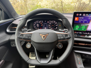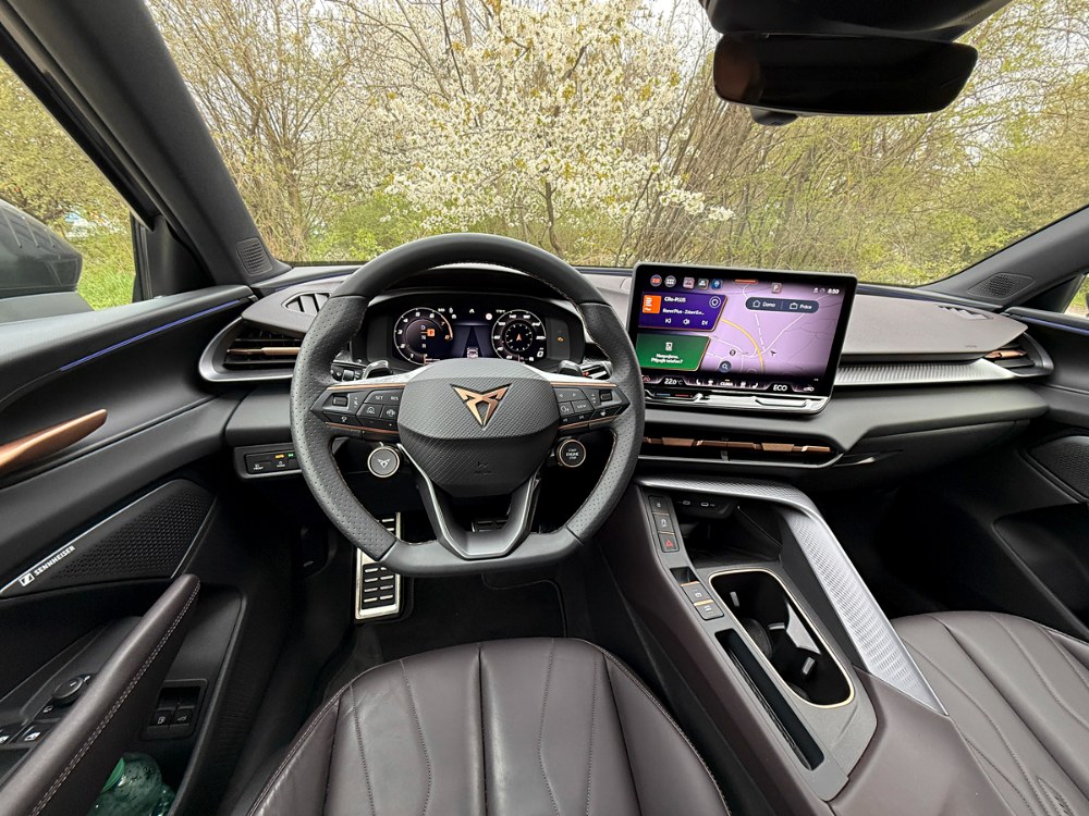 Dotykový displej infotainmentu reaguje rychle a menu je logicky uspořádané. K dispozici je rychlý přístup k často používaným funkcím a případně také hlasové ovládání, které ale má v českém jazyce stále velké rezervy. Fyzická tlačítka jsou umístěna především na volantu, včetně startu motoru a volby režimu Cupra.