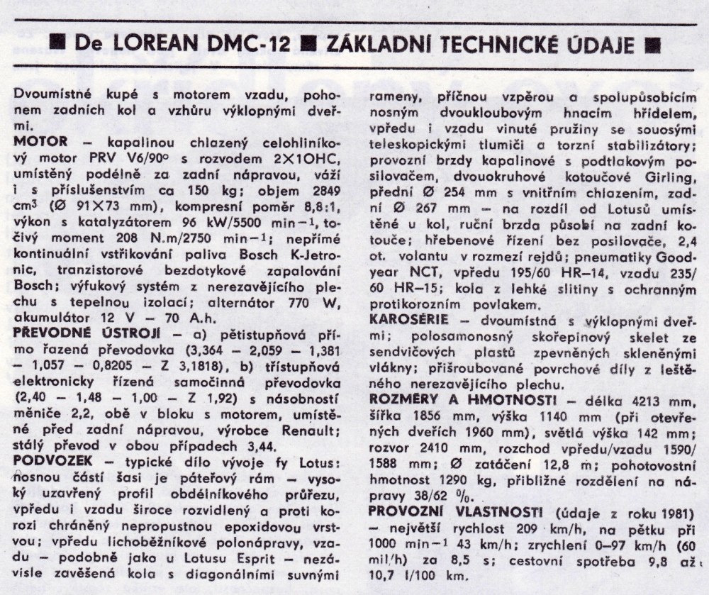 Díky iniciativě našeho redakčního spolupracovníka Ing. Libora Bárty a díky ochotě a porozumění našeho amerického krajana Václava Špaňka jsme měli možnost alespoň krátkého seznámení s velmi exkluzivním a v Evropě mimořádně vzácným sportovním vozem De Lorean. Je zajímavá historie jeho vzniku i jeho technická koncepce. John Z. de Lorean se narodil v roce 1926 a má za sebou skvělou kariéru v americkém automobilovém průmyslu. Vyvrcholením funkcemi generálního ředitele automobilek Pontiac a Chevrolet, a pak dokonce viceprezidenta celého koncernu General Motors. Na tuto funkci však De Lorean v roce 1973 rezignoval, aby mohl založit vlastní automobilku, která by vyráběla sportovní vůz podle jeho představ.