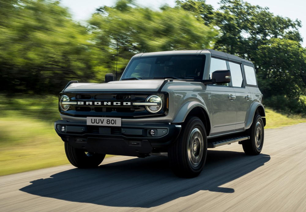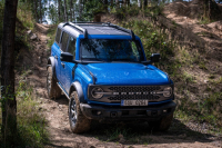 Během prvních zkušebních jízd s oběma verzemi určenými pro Evropu jsme měli možnost vyrazit do náročného terénu. V obou případech byla z vozu jasně cítit jeho robustnost. Ochranné ocelové prvky podvozku a prahů umožnily využít nájezdového a přechodového úhlu na maximum. Příkladná ale byla také přehlednost karosérie, daná hranatými tvary a úchytnými oky na rozích kapoty, a především možnost jemného modulování hnací síly ke kolům a přesné řízení. Vyzkoušeli jsme jak jízdu po boulích s maximálním vyvěšením kol, kdy se ukázala tuhost nosného rámu a efektivita pohonu všech kol v situacích, kdy bylo jedno či dvě kola ve vzduchu, tak rovněž průjezd rozbahněnou oblastí. Tam se ke slovu dostalo vynikající sladění především elektronických systémů, jež se mohly opřít o pevný mechanický základ. Bronco zkrátka dává v terénu pocit suverénní nadřazenosti nad nástrahami přírody, což lze v podobné míře zažít pouze u několika konkurentů, z nichž jedním je bezpochyby Jeep Wrangler.