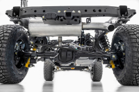 U obou verzí je okamžitě při jízdě zřejmá robustní koncepce s pevným nosným rámem, na němž je připevněna karosérie. I proto může mít na čtyři díly rozdělenou střechu, kterou je možné snadno sejmout. Odmontovat lze také dveře, ovšem v této konfiguraci Bronco nesmí na silnici. Vzadu Ford použil robustní tuhou nápravu Dana 44, již doplnil Panhardskou příčkou, vpředu jsou umístěna kovaná dvojitá příčná ramena – toto řešení umožnilo snížit neodpruženou hmotnost o 20 procent. I tak se podařilo zachovat značné dráhy propružení, a to až 259 mm. Terénní výbavu doplňují pohony všech kol s redukčními převodovkami, v případě verze Badlands jde o systém s centrálně umístěnou elektronicky řízenou spojkou připojující podle potřeby (v režimu 4A) kola přední nápravy. K dispozici je také zcela otevřené nastavení 2H, případně plně uzavřené 4H a s elektricky řazenou redukcí 4L. Celek doplňují elektronicky řízené závěry nápravových diferenciálů, stejně jako možnost odpojit přední příčný zkrutný stabilizátor.