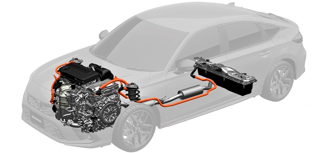K vyšší úrovni komfortu a ovladatelnosti dále přispívá také o 10 mm snížené těžiště, ložiska kol, čepy a další prvky závěsů kol se sníženým třením, nové materiály silentbloků, bezmála desetinásobně větší délka lepených spojů dílů karoserie, aktivní korelace hluku (ANC) nebo lehký a vysoce pevný přední pomocný rám z hliníkových slitin. Stabilitu a potěšení z jízdy podtrhuje kromě delšího rozvoru a většího rozchodu zadních kol také nastavení poháněcího ústrojí, jež v zatáčkovitých úsecích udržuje vyšší otáčky motoru pro eventuální potřeby hladkého a okamžitého zrychlení na výjezdu ze zatáčky a přirozeného rekuperativního zpomalování před další zatáčkou. Z mapových podkladů navigace čerpá (pro Hondu vůbec poprvé) Eco Assist, systém, jenž podle konfigurace ze strany řidiče efektivně upravuje úroveň nabití akumulátoru (jednoduše: ve stoupání akumulátor vybije na minimum, když ví, že jej při následném sjezdu bude moci opět nabít). Originální hybridní poháněcí ústrojí Honda e:HEV má v Civicu proti CR-V nepatrně větší nejvyšší točivý moment zážehového dvoulitru, který pracuje prakticky pouze jako zdroj elektrické energie pro elektromotor. Ten je uložen na společném hřídeli s generátorem a propojen důmyslnou, ale v podstatě velmi jednoduchou soustavou spojek v jeden celek se spalovacím motorem, jenž se ovšem do pohybu vozu přímo zapojuje dle uvážení elektroniky pouze v rychlostech nad 80 km/h (děje se tak zcela neznatelně prostřednictvím zubové spojky; Civic nemá žádnou převodovku), tedy specificky v ustáleném, zejména dálničním provozu. V něm totiž „benzín-elektrické“ ústrojí postrádá pro ztráty (zvýšený aerodynamický odpor, minimum příležitostí pro rekuperaci atd.) efektivitu, elektromotor však i v tomto módu zůstává v záloze jako podpora pro případ náhlé potřeby zrychlení. Ve všech ostatních režimech nový Civic pohání pouze elektromotor energií dodávanou buď z akumulátoru (uloženou při rekuperativním brzdění), nebo získávanou přes generátor prostřednictvím motoru s vnitřním spalováním. Pro přívětivější akustický projev při intenzivní akceleraci motor mírně kolísá v otáčkách ve snaze simulovat „změny převodů“.