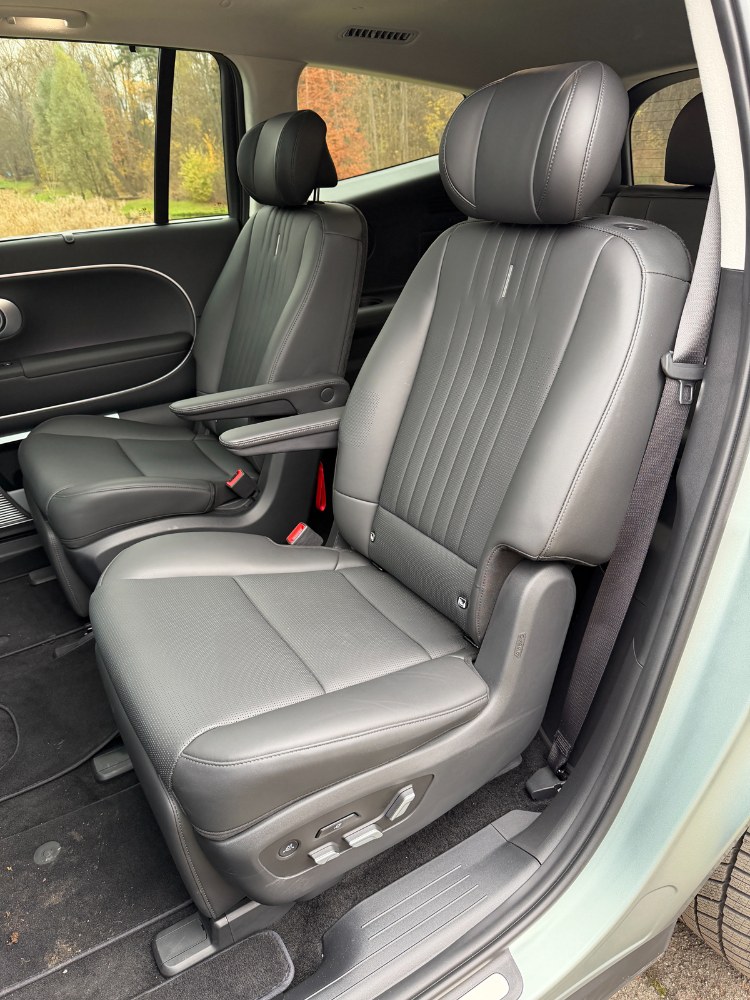 Hyundai Ioniq 9 je typické SUV amerického střihu – je velké, a to jak zvenku, tak uvnitř. Na délku měří přes 5 metrů (5060 mm), z toho 3,1 metru (3130 mm) připadá na rozvor náprav. Hyundai je nabízí v základní pětimístné verzi, v sedmimístné konfiguraci, a dokonce i v šestisedadlovém uspořádání se dvěma individuálními křesly ve druhé řadě. Šestimístná konfigurace je výsadou nejvyšší testované výbavy Calligraphy a sedadla mohou být buď otočná, což ve voze vytvoří konferenční prostor, nebo plně elektricky ovládaná, vybavená masážní funkcí a opěrkami nohou pro maximální komfort. Přestože jsou mimořádně pohodlná, intenzita masáže by mohla být větší. To platí i pro sedadla vpředu. Na druhou stranu jsou masážní funkcí vybaveny i sedáky, což konkurence nabízí jen výjimečně.