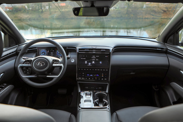 Pracoviště řidiče budí hned po usednutí velmi harmonický dojem. Obvyklá „kaplička“ chybí a nahradil ji druhý 10,25palcový displej. Byli jsme ujištěni, že ani na slunci se nezrcadlí, což jsme však s ohledem na zimní počasí neměli příležitost ověřit. Volant znamenitě padne do ruky a nese na svých ramenech příjemné a logicky rozmístěné fyzické přepínače. Tucsony se samočinně řadícími převodovkami mají krátký panel navazující v přední části na středovou loketní opěru, připomínající svým řešením třeba elektrický Ioniq. Namísto voliče převodovky totiž nese jen tlačítkové přepínání směru jízdy a ve své přední hraně řadu fyzických přepínačů včetně vyhřívání a ventilace sedadel. Výrobce celek označuje pojmem Interspace, vysvětlovaným jako přirozený průnik prostoru, technologií a informací.