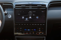 Zpracování interiéru je výrazně jiné než v případě exteriéru. Uvnitř nový Tucson působí velmi jednoduchým a přehledným dojmem. Vévodí mu zdvojené vodorovné linky, které vedou přes dveřní obklady a sbíhají se až kolem středového panelu. Zajímavostí je, že na palubní desce jsou mezi těmito lištami v celé délce skryty mřížky výdechů ventilace, takže temperovaný vzduch do prostoru pro posádku vystupuje větší plochou, a tedy plynuleji. Fyzické ovladače ze středového panelu zcela zmizely (levnější verze si ale nejspíš tlačítka zachovají). Nahradil je v horní části 10,25palcový dotykový displej a pod ním umístěné dotykové body panelu ovládání ventilace a zkratkových kláves pro rychlé přepínání jednotlivých menu multimediálního systému.