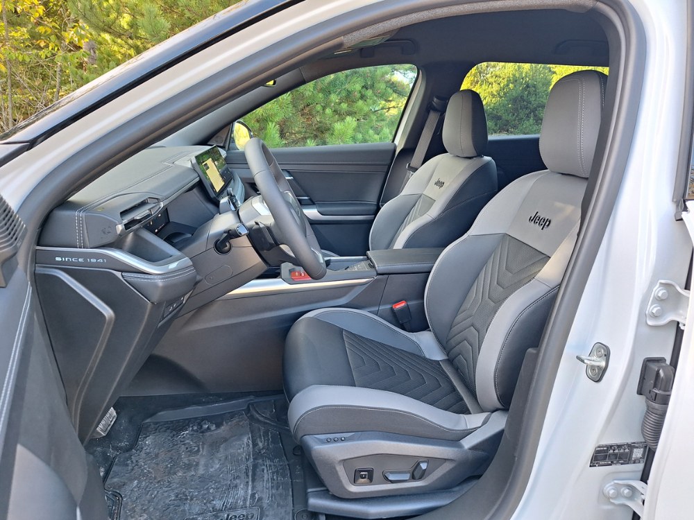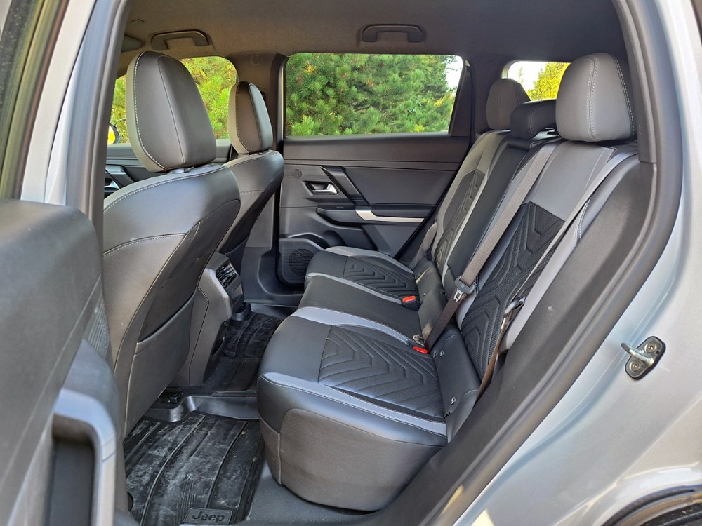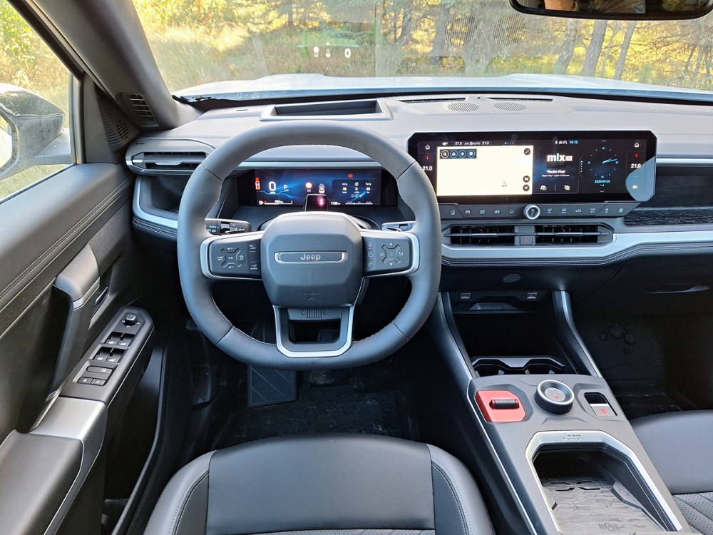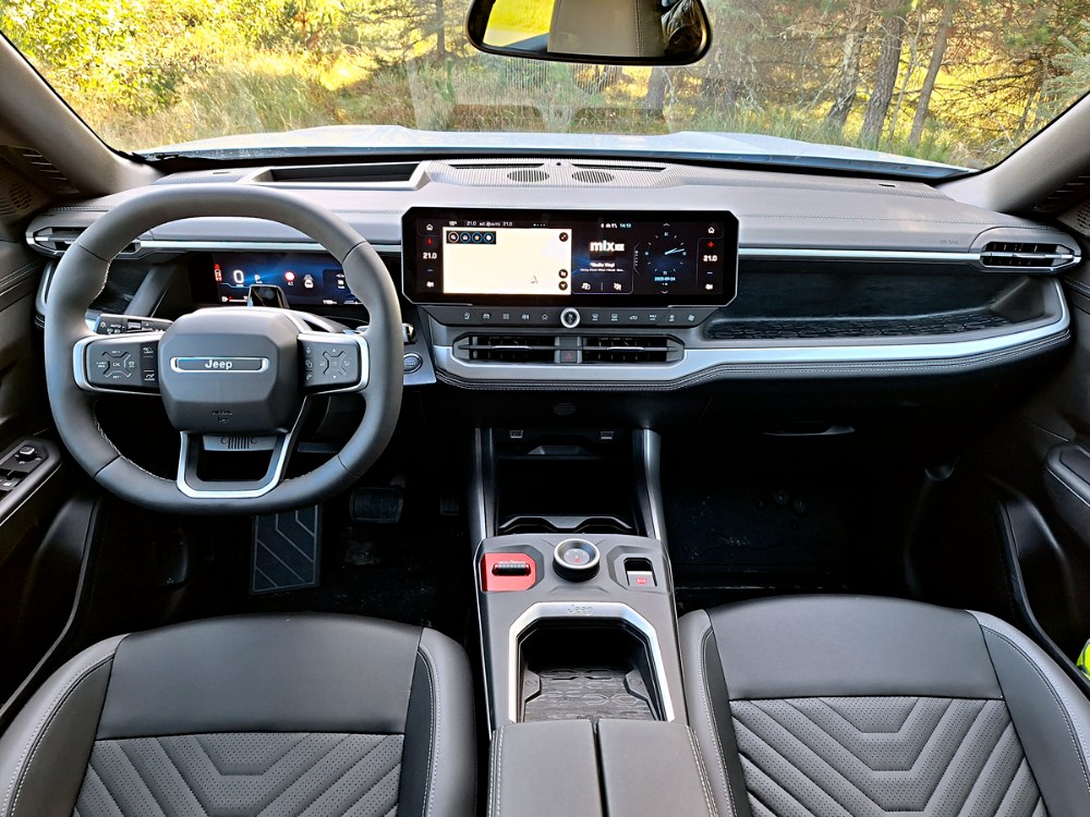 V proporcích karoserie Compassu zřejmě příbuznost s výše zmíněnými deriváty objevíte, ovšem stylisté italského studia se snažili, aby mu vtiskli charakter skutečných Jeepů. Zaznamenáme tak třeba „hranaté“ obklady lemů blatníků nebo typickou masku se sedmi svislými segmenty. Chybět nemohou ani obvyklé vtipné detaily v podobě skrytých odkazů na první Jeep z roku 1941. Uvnitř je tato příbuznost výraznější, ale zejména co se některých obkladových materiálů týče. Pojetí dveřních výplní i středové konzoly je specifické a budí dojem kýžené robustnosti. Totéž platí i o pracovišti řidiče a palubní desce. Ta je strukturována přísně vodorovně a jejímu středu dominuje širokoúhlý dotykový monitor, jaký u žádného jiného automobilu Stellantisu nenajdete. Dbalo se na dostatek odkládacích schránek i přehlednost obsluhy, volant s malým průměrem a velmi tlustým věncem znamenitě padne do rukou. Vedle otočného ovladače převodovky na konzole je přepínač Selec-Terrain (standardem pro všechny verze), jenž upravuje nastavení řízení pohonu a brzd a má alespoň částečně nahradit absenci pohonu všech kol.