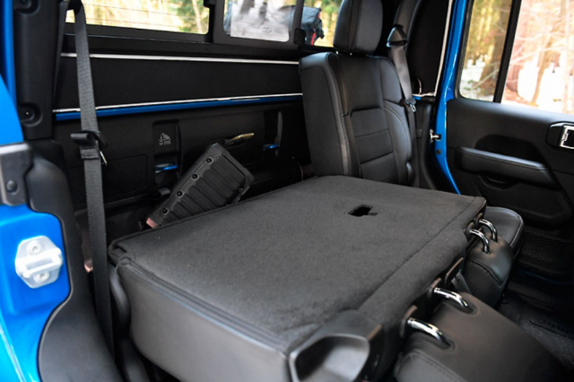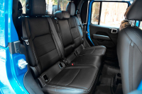 Již usednutí do vysokého Gladiatoru je výjimečným zážitkem. Místa je na sedadlech tak akorát, středové partie interiéru totiž ovlivňuje masivní tunel skrývající převodovku vpředu a pohon zadní nápravy vzadu. Řidič se může těšit na veškeré myslitelné komfortní a bezpečnostní výdobytky současnosti, ale především těsné sepětí se svým strojem. Myslelo se na každý detail. Kromě decentně skrytých emblémů s původním Willysem lze třeba kouzlit se zadními sedadly. Po sklopení opěradla tak můžete vyjmout jinak trvale dobíjený externí, odolně pogumovaný Bluetooth reproduktor, jenž zpříjemní každý piknik ve volné přírodě. Naopak po zdvižení sedáku se objeví schránka s povinnou výbavou a jinými drobnostmi. Je uzamykatelná a její rozměry i s ohledem na původ vozu však spíše směřují k uložení dlouhé palné zbraně.