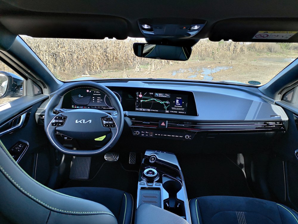 Interiér GT je prakticky shodný s výchozím modelem EV6 (viz výše odkazované články), nicméně cestující vzadu mají o 16 mm více prostoru pro kolena vlivem nasazení skořepinových předních sedadel. Ta přitom poskytují nejen znamenitou boční oporu, a to i v oblasti ramen, ale překvapivě též dostatečnou poddajnost pro každodenní využití.