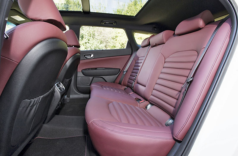 Za pozornost v tomto kontextu stojí prolis obstupující celou karoserii a opticky propojující přední a zadní svítilny, jakož i spodní linie bočního zasklení, výrazně stoupající směrem vzad. Trumfem Optimy SW je ale prostor v zadní části karoserie. Zavazadlový prostor v základním uspořádání pojme 552 l nákladu a lze jej zvětšovat postupným sklápěním opěradel zadních sedadel, dělených v praktickém a stále nepříliš obvyklém poměru 40:20:40, na sedáky, a to až na 1686 l. Využitelnost tohoto objemného prostoru při přepravě drobnějších předmětů rozšiřuje řada praktických drobností včetně dvojité podlahy s trojicí oddělených schránek, háčků pro zavěšení tašek nebo hliníkových lišt pro variabilní upevnění speciálních oddělovacích příčníků. Svinovací krycí roleta chodí v celé délce svého posuvu v drážkách, takže odpadají nepříjemnosti s její fixací při natahování. Zájemce o sportovně střižený vůz s dostatkem stability ve vyšším jízdním tempu a výkonovou rezervou chce oslovit Optima GT, dostupná s karoserií sedan i kombi.