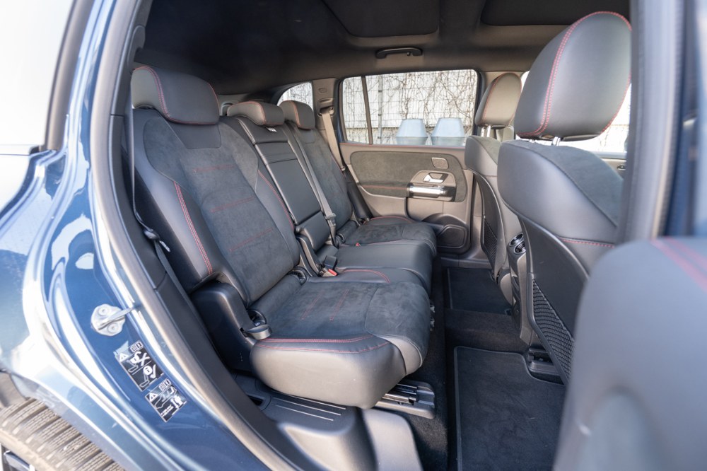 V případě středně velkého SUV EQB je základem Mercedes-Benz třídy B, jenž je součástí rodiny kompaktních modelů s motory vpředu napříč čítající třídy A, B, CLA a GLA. GLB, resp. elektrické EQB jsou jako jediné z nich postavené na rozvoru prodlouženém o 100 mm, což spolu s hranatou karoserií umožnilo nabídnout možnost objednání třetí řady sedadel (příplatek 21 182 Kč), a tedy i sedmimístného uspořádání. Tato možnost zůstala zachována i pro elektrickou verzi. Dvojice zadních míst je sice určena pouze pro osoby s výškou do 1,65 metru, nicméně pro ně nabízí překvapivý komfort. Silnou stránkou je také bezpečnost, protože EQB má i pro cestující vzadu připraveny bezpečnostní pásy s předpínači a omezovači tahu, samozřejmostí jsou hlavové airbagy zasahující po celé délce bočních oken. Cestující ve třetí řadě sedadel mají připraveny také USB-C konektory pro nabíjení telefonů. Variabilitu zadní části podtrhují o 140 mm posuvná sedadla druhé řady dělená v poměru 40:60 s opěradly rozdělenými podle praktického schématu 40:20:40.