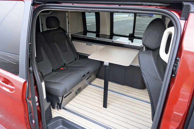 Po vyklopení stolku a otočení předních sedadel o 180 stupňů vznikne uvnitř vozu obývací pokoj. Jeho přeměna na ložnici je snadná. Stačí držet příslušná tlačítka na druhé řadě sedadel, a ta se sklopí do roviny. Svojí pozicí navážou na pevný prvek v zavazadlovém prostoru a umožní vznik lůžka s rozměry 2030 x 1130 mm. I když složená sedadla poskytují dostatečný komfort, lze jen doporučit objednat také tenkou matraci, jež povrch ještě lépe vyrovná.