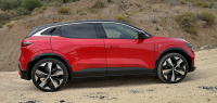 Zvolená koncepce je sice rozumná, ale pro rychlejší jízdu nepříliš vhodná. Poháněná přední náprava ztrácí při odlehčení během zrychlování a výjezdu ze zatáčky trakci (400kg akumulátor je přeci uprostřed vozu) a trhá řidiči volant z rukou. Konstruktéry Renaultu jsme na tuto nepříjemnou skutečnost s kolegy z poroty COTY opakovaně upozorňovali a byli jsme ujišťováni o tom, že „se o tom ví“ a že „se na tom pracuje“. U sériových vozů jsme zaznamenali plynulejší zásahy stabilizačního systému, což ovšem ryze „fyzický“ problém dosud uspokojivě nevyřešilo. Při plynulé jízdě je chování Megane E-Tech Electric předvídatelné a vyvážené a celkově podporuje předpoklad, že elektromobily budou určeny zejména klidným přesunům na krátké vzdálenosti. Dále jsme zaznamenali velmi ostré reakce pedálu rekuperačního brzdění a zvýšený aerodynamický hluk kolem zpětných zrcátek v rychlostech přes 70 km/h. Lépe vybavené verze mohou mít digitální vnitřní zpětné zrcátko, což s ohledem na velmi nízký průhled zadním oknem řidič rozhodně ocení.