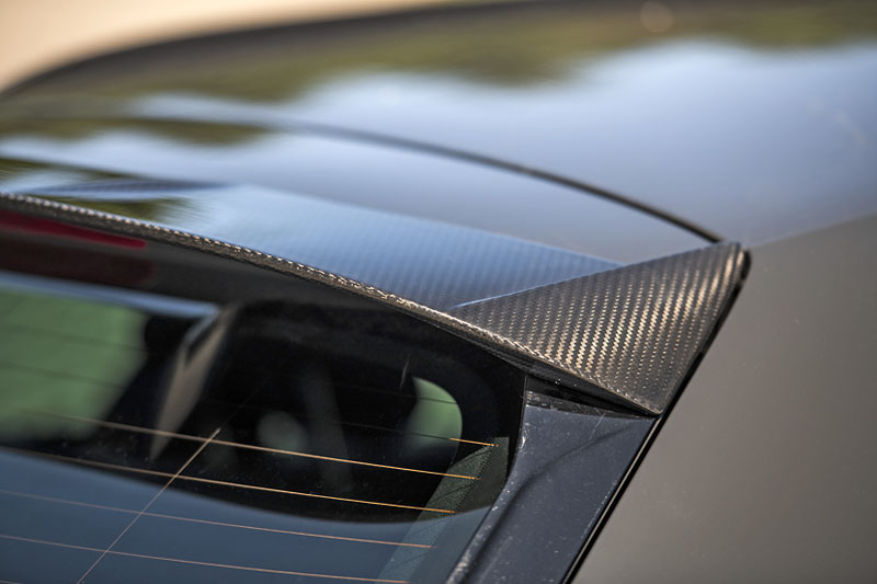 Speciální verze je ve srovnání s výchozím provedením o 250 tisíc korun dražší, co za to nabízí? Odlišnosti jsou jasně patrné na první pohled a vyznačují se různými doplňky lakovanými měděnou barvou, jež vhodně ladí s jednou ze tří barev karoserie (bílou, černou nebo testovanou šedou). Měděný odstín je použitý například na o palec větších 19“ kolech, stejně jako na pevných třmenech zvětšených brzd Brembo. Průměr předních kotoučů narostl z 340 na 370 mm. Při pohledu zvenku jsou také jasně patrné například aerodynamické doplňky karoserie vyrobené z ručně zpracovávaných uhlíkových kompozitů. Kvalita jejich provedení je na velmi vysoké úrovni a svědčí o mimořádné péči. Mezi prvky z tohoto lehkého, pevného a nákladného materiálu patří především přední spoiler na spodní hraně předního nárazníku, nástavce prahů, výplň zadního difuzoru se čtveřicí podélných výběžků a v neposlední řadě i výrazný střešní spoiler.