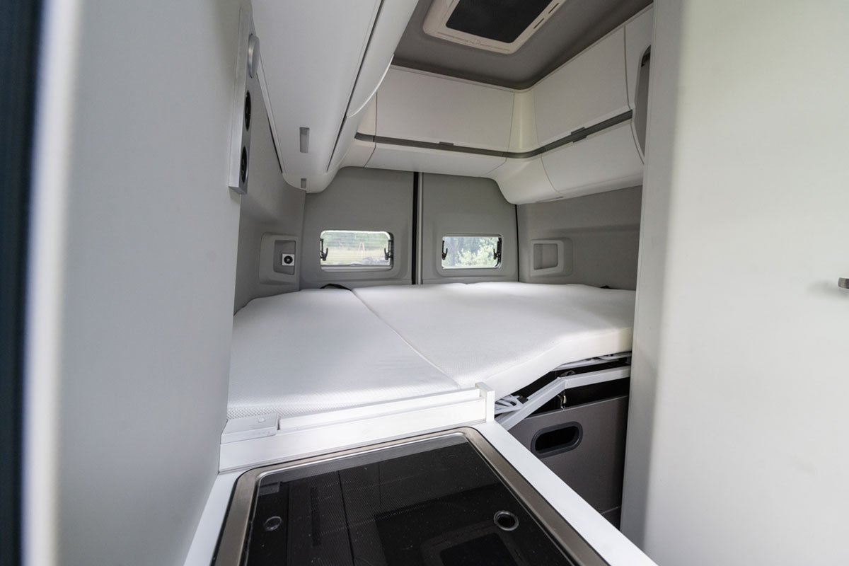 Všechny výše uvedené prvky jsou součástí standardní výbavy, k níž patří také velmi dobře zpracované sítě proti hmyzu na bočních dveřích a systém zatemnění s chytře navrženými posuvnými sítěmi a stínítky v každém okně. Pro čelní okno a boční okna kabiny jsou připraveny účinné látkové kryty. Praktickou samozřejmostí jsou i objemné uzavíratelné schránky umístěné pod stropem. Ve výbavě nechybí ani výsuvný schůdek před bočními dveřmi.