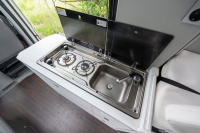 Proti toaletě je umístěna kuchyňka částečně zasahující do prostoru otevíraného posuvnými dveřmi. Její standardní výbavou je nejen lednice s objemem 70 l, jejíž součástí je i mrazák, ale také dvojice plynových plotýnek a dřez. Přes vařič a dřez je umístěno výklopné krycí sklo, jež může tvořit kuchyňskou pracovní desku. Tu lze dále rozšířit na levou i pravou stranu. Pod umyvadlem je zabudovaných několik prostorných odkládacích skříněk, jež jsou vybavené, stejně jako ostatní úložné prostory, praktickými úchytkami, které jsou v uzavřené pozici zcela zapuštěné. Na pravé straně vozu za kuchyňkou je pod postelí, a tudíž ve vytápěném interiéru, umístěna 110litrová nádrž na čistou vodu, jež se doplňuje zvenku. Za ní je prostor na dvojici 11kg plynových bomb sloužících pro vaření, ohřev vody a také pro vytápění. Proti nim se pod postelí na levé straně vozu nacházejí úložné skříňky. V jedné z nich je centrum elektrického obvodu obytné nástavby.