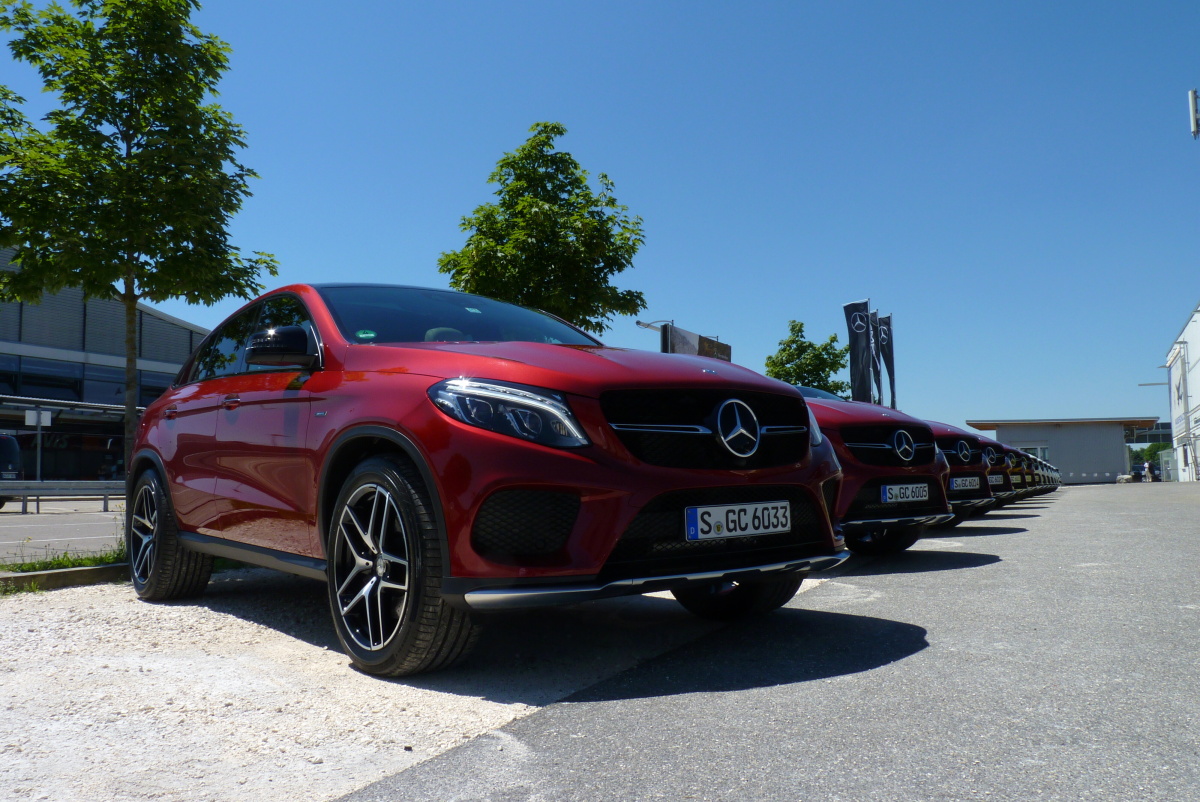 Jak dnešní jízdy potvrdily, výrazně sportovněji je zaměřena zcela nová řada Mercedes-Benz GLE Coupe. Zkoušeli jsme nejprve zážehové provedení GLE 450 AMG/270 kW a následně diesel GLE 350 d/190 kW (jediný diesel v nabídce!). Výroba totiž byla svěřena závodům Mercedes-Benz v USA, o čemž také svědčí zaměření produktu. Pohonné ústrojí je koncipováno podélně, tedy s motorem uloženým v podélné ose vozu náhonem předních kol vyvedeným paralelním hřídelem k přední nápravě. Řízení je precizní, dělení točivého momentu 50:50 (u AMG 60:40 ve prospěch zadní nápravy) zajišťuje optimální chování při ostrých průjezdech zatáčkami na hraně adheze. Náklony karoserie v zatáčkách výrazně omezuje soustava vzduchového pružení Airmatic ADS Plus, jež na druhou stranu v řidiči poněkud potlačuje pud sebezáchovy a limity kontaktu pneumatik s vozovkou přichází dosti nečekaně…